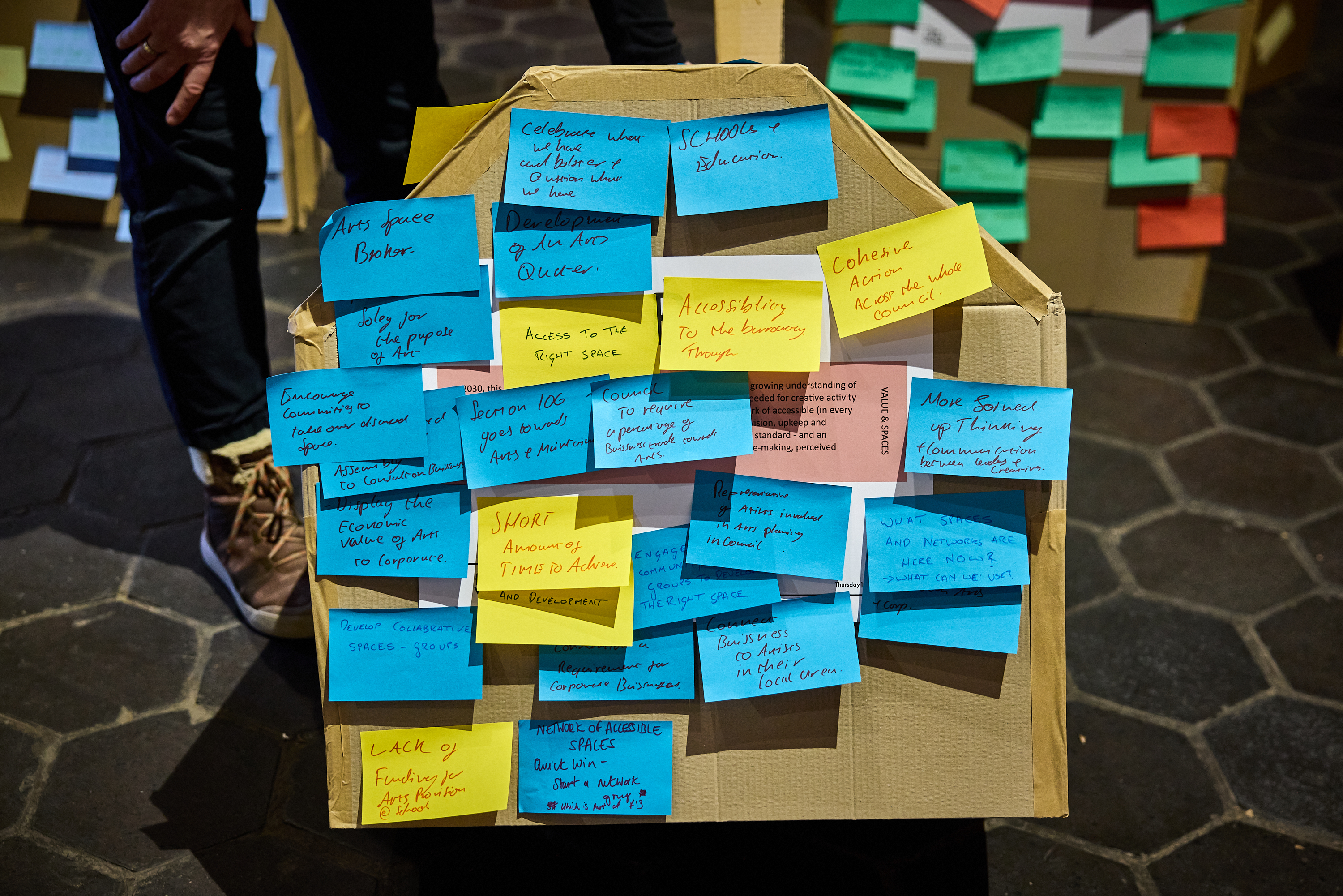 Group Prompt: In 2030, this is a place that values creativity and collaboration. There is a growing understanding of the value of the arts, culture and creativity to this place, and of what is needed for creative activity to thrive at every level from hobbyist to specialist. There is vibrant network of accessible (in every sense) spaces to make and share work, an active commitment to the provision, upkeep and maintenance of public art, heritage assets and cultural buildings to a high standard – and an understanding of the way this relatively small investment impacts on place-making, perceived value, community, social cohesion and civic pride.