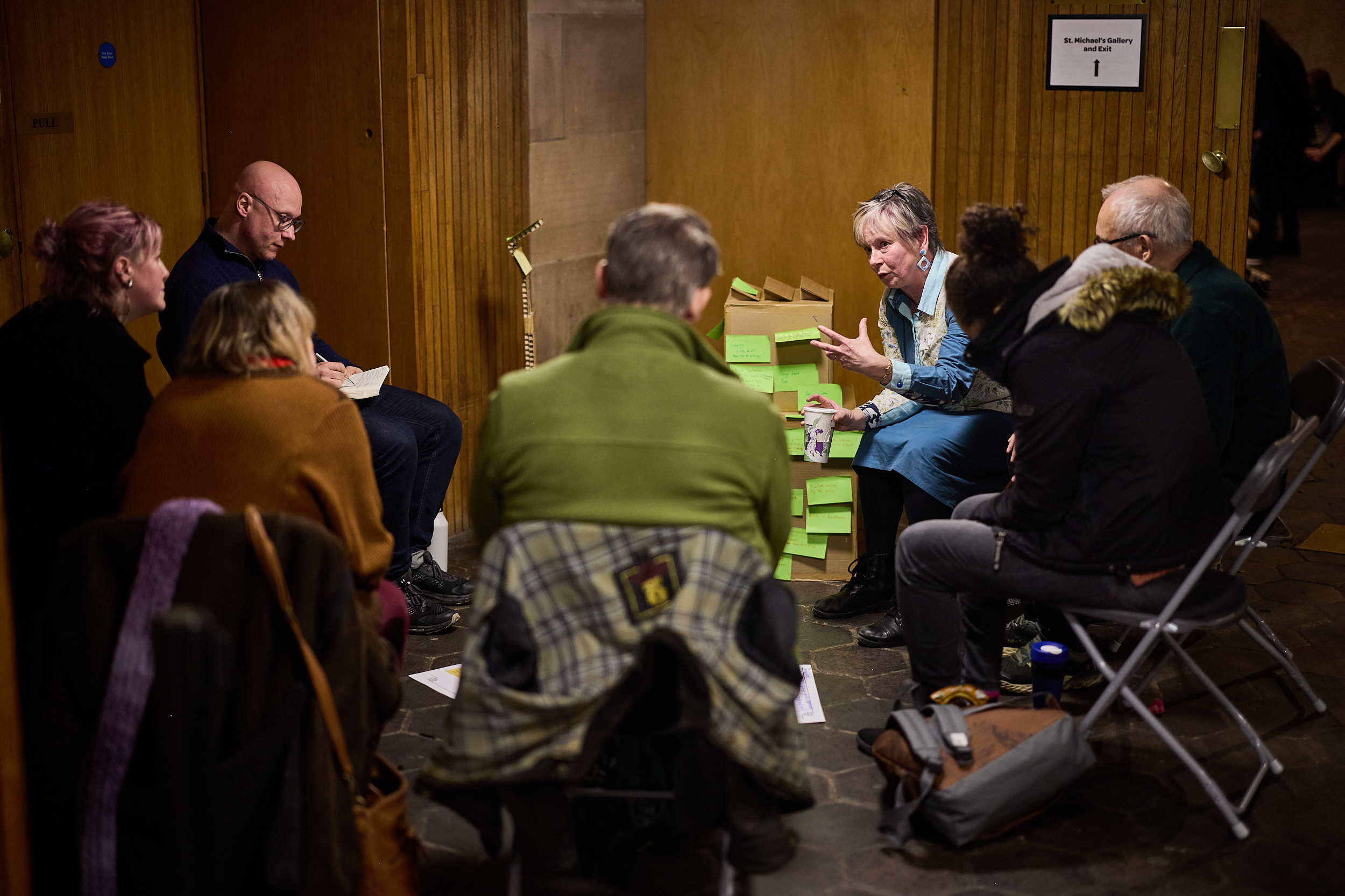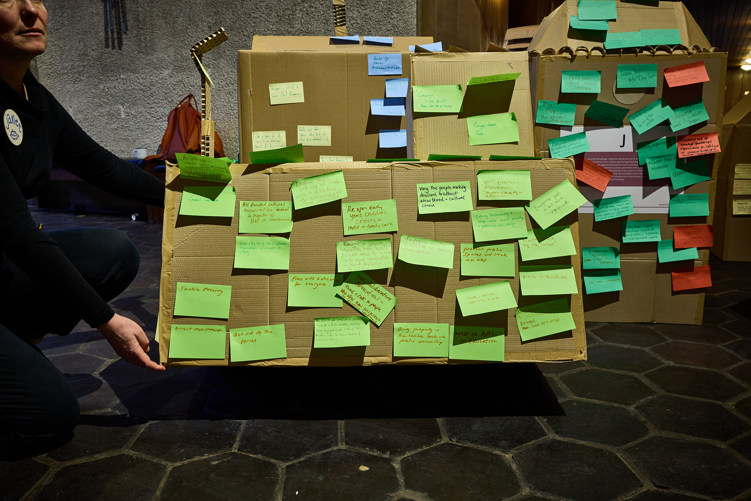 We had a very lively discussion right from the get-go. Everyone had plenty to say and we could have spent the whole time just talking about the mission statement. We managed to convert that energy onto the post-it notes and there was lots of discussion while participants were writing and sticking! Our actions covered a wide range of subjects from ending capitalism to embedding artists in the council to bringing back pride and making sure the arts are fully on the curriculum.